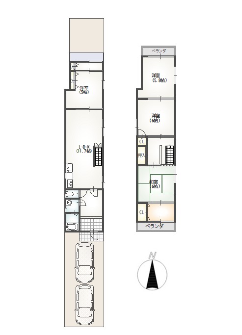 南向き・2台駐車可 令和7年10月改装済み クロスCF貼替 階段カーペット貼替 ビルトインコンロ交換 洗面台交換 シャワー便座交換 ユニットバス交換